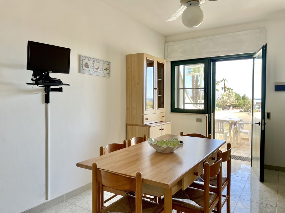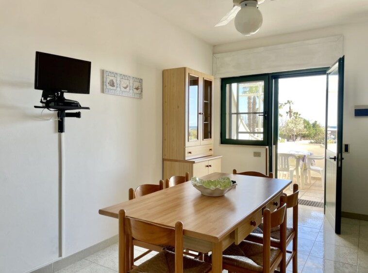 L’alloggio proposto è dislocato a piano primo ed è composto da: due camere da letto, ampio soggiorno con angolo cottura, disimpegno, ampio terrazzo attrezzato con tavoli, sedie e barbecue.